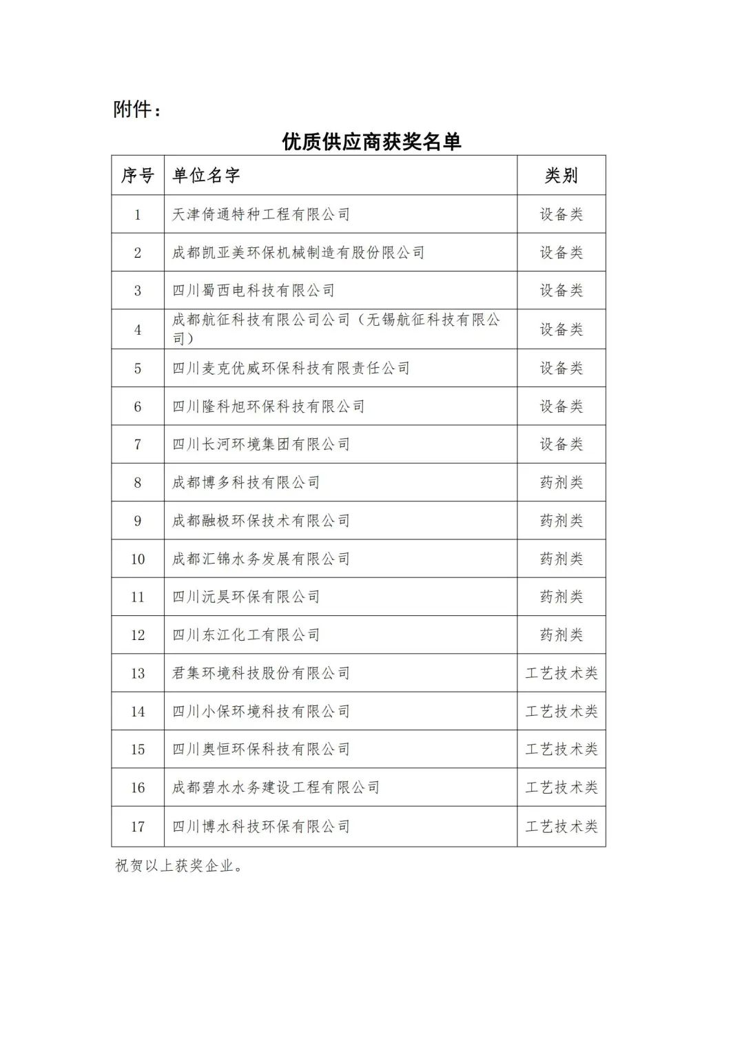 四川省水污染治理服務協會評選出的17家優質供應商中,有幸看到了我們的名字!