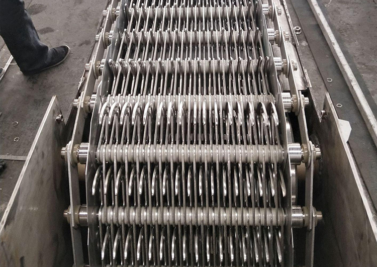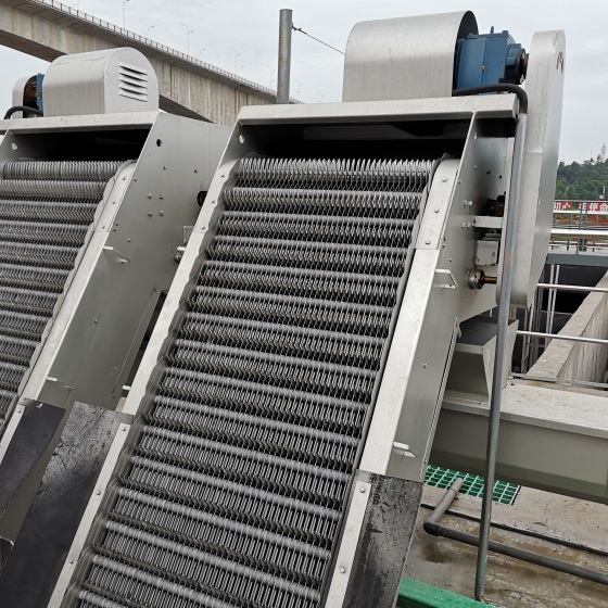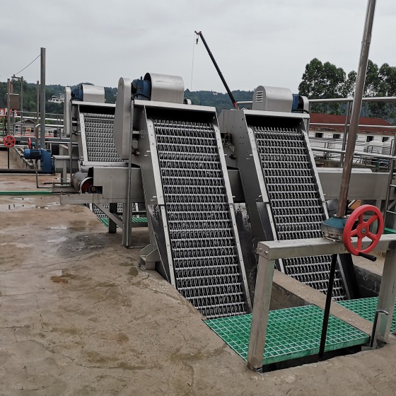 耙齒鏈運轉到設備的上部時,由于槽輪和彎軌的導向,使每組耙齒之間產生相對自清運動,絕大部分固體物質靠重力落下。另一部分則依靠清掃器的反向運動把粘在耙齒上的雜物清掃干凈;